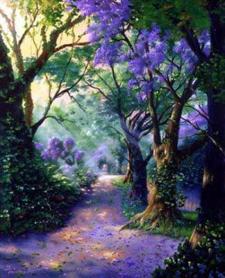 Bientôt envolée, elle voit les couleurs en bas dessiner la palette d’un peintre. Les deux fées se dirigent vers une clairière tapissée d’un joli parterre de fleurs bleues pour s’y poser. Autour des myosotis, volette un joli papillon qui fascine Linotte. C’est la fée des papillons, qui l’entraîne de jonquilles en violettes ; les deux amies séloignent peu à peu de la clairière où se tient la Fée du Matin.